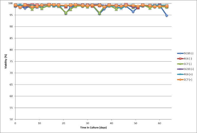 - Single cell clones show stability over 60 days in respect to cell growth, maintaining high viability and specific productivity